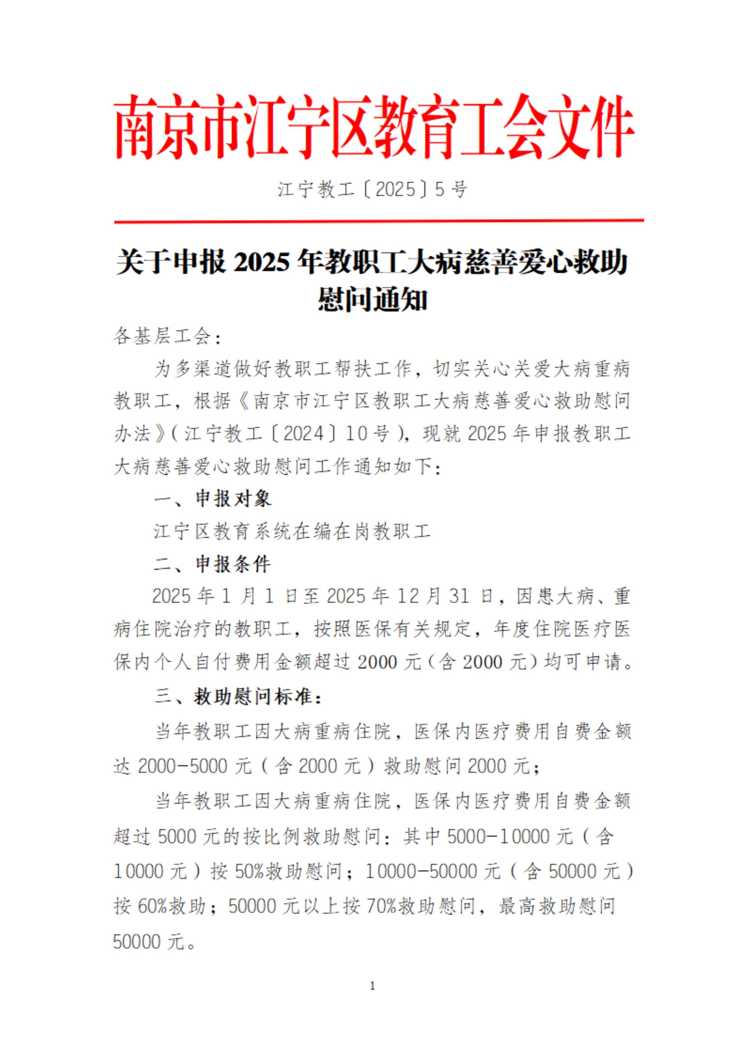江宁教工〔2025〕5号关于申报2025年度教职工大病慈善救助慰问通知