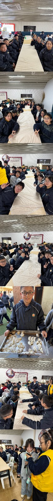 劳动过后,同学们又齐聚一堂,开启了包饺子的欢乐环节。食堂里,案板、擀面杖、馅料一应俱全。大家围站在桌旁,有的擀皮,有的包饺子,手法虽略显稚嫩,却个个干劲十足。不一会儿,形状各异的饺子摆满了托盘。当热气腾腾的饺子端上桌,同学们品尝着自己亲手包的饺子,心中满是成就感与幸福感。